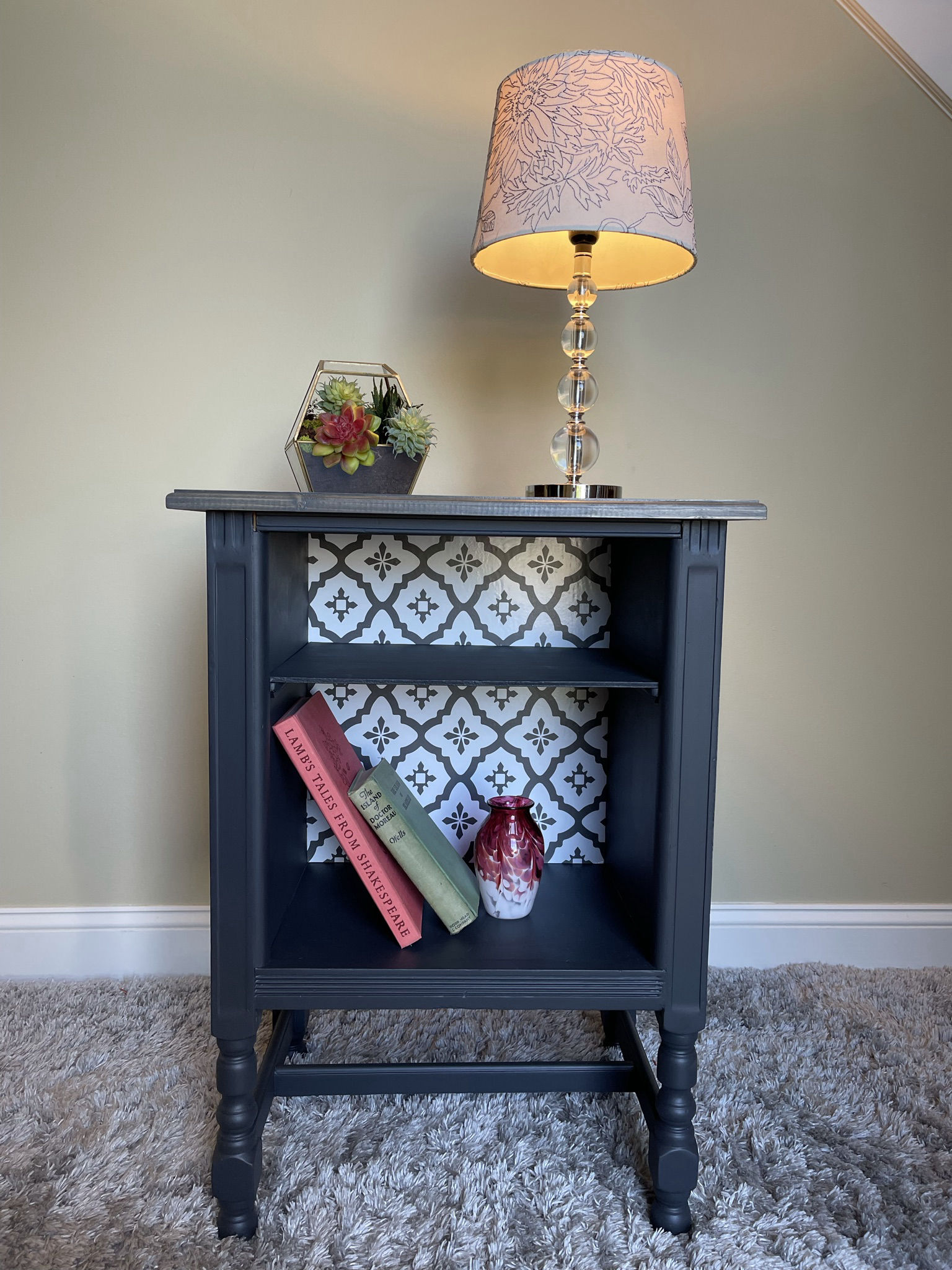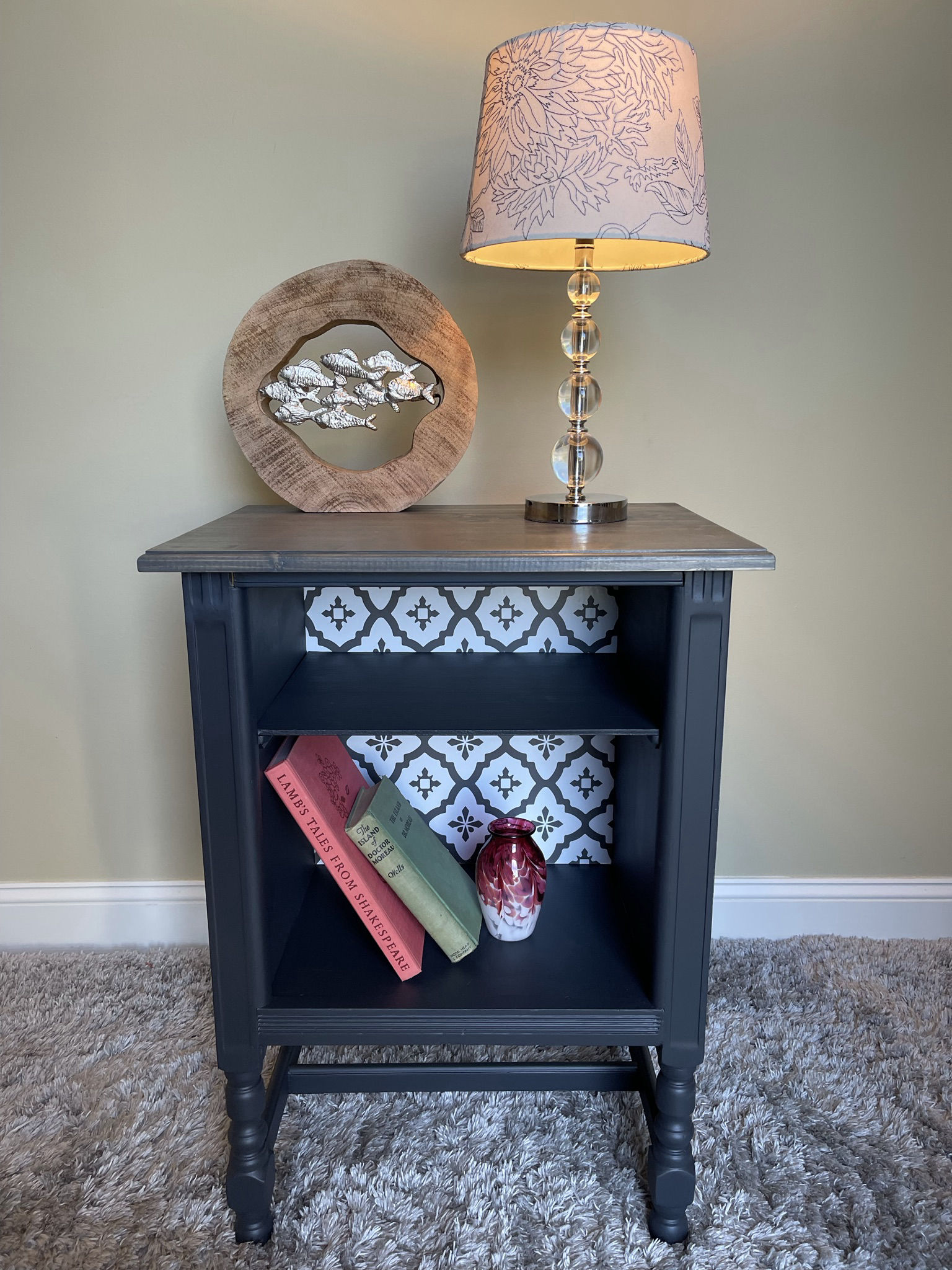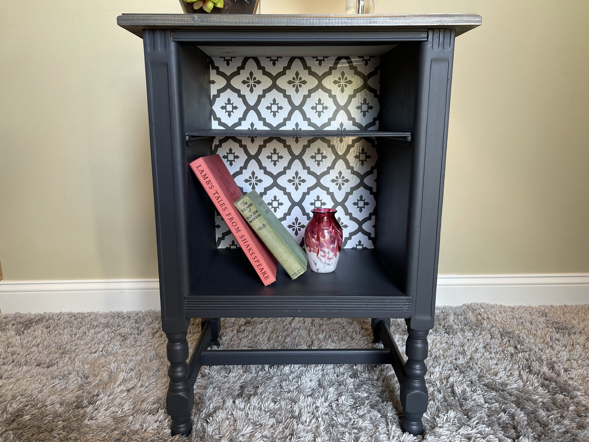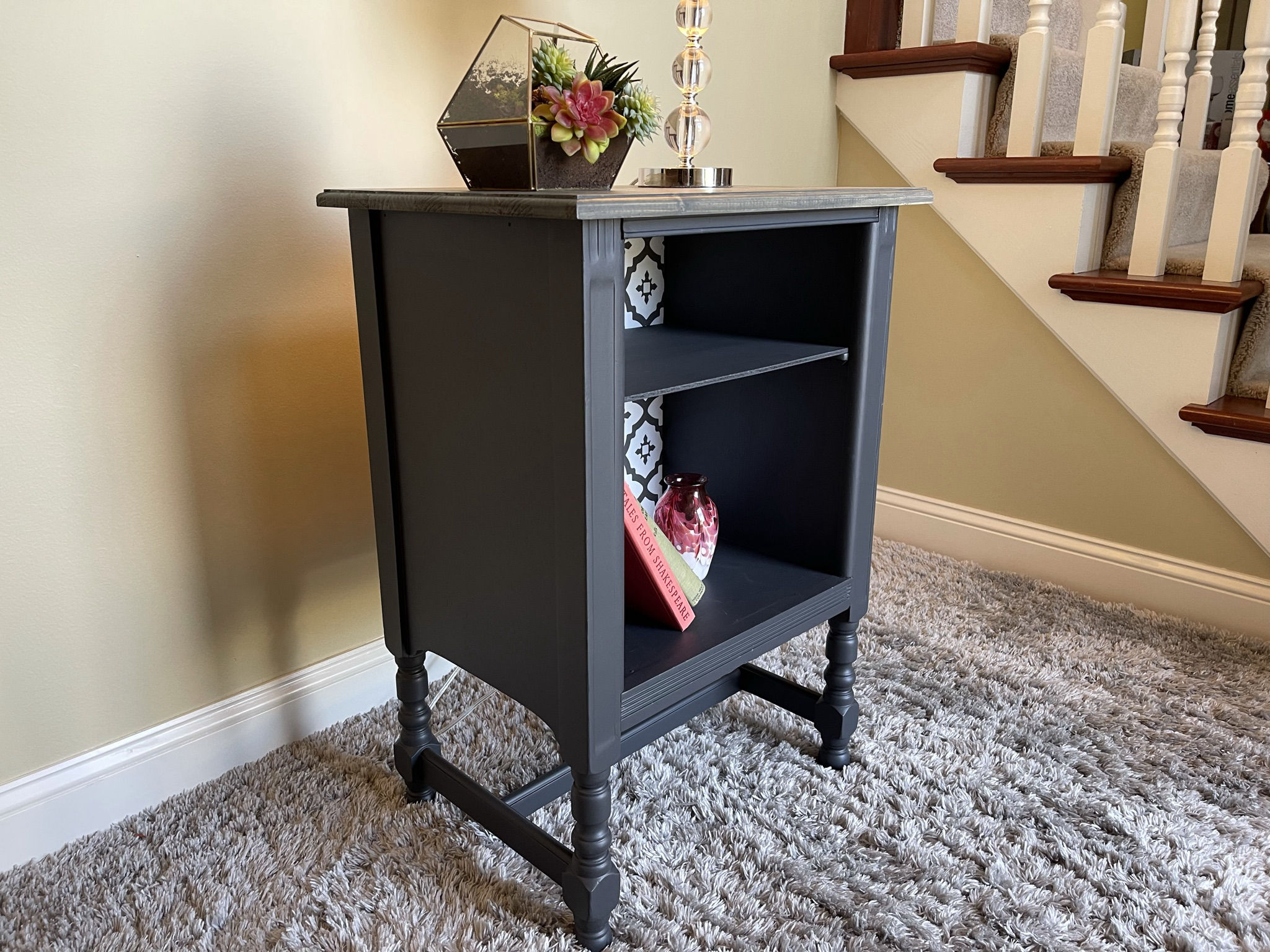 This antique side table started life in the 1940s and was later used as a telephone stand. Being in rough shape, we built a new top and refinished everything in Fusion Mineral paint called Ash. The top has been stained to match. To add character and charm, part of the interior has been covered in contemporary vinyl wallpaper.