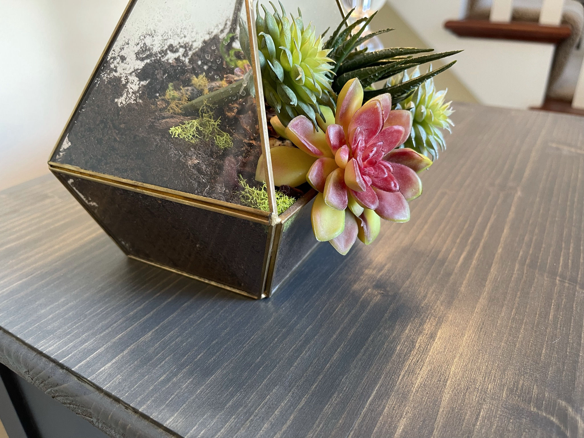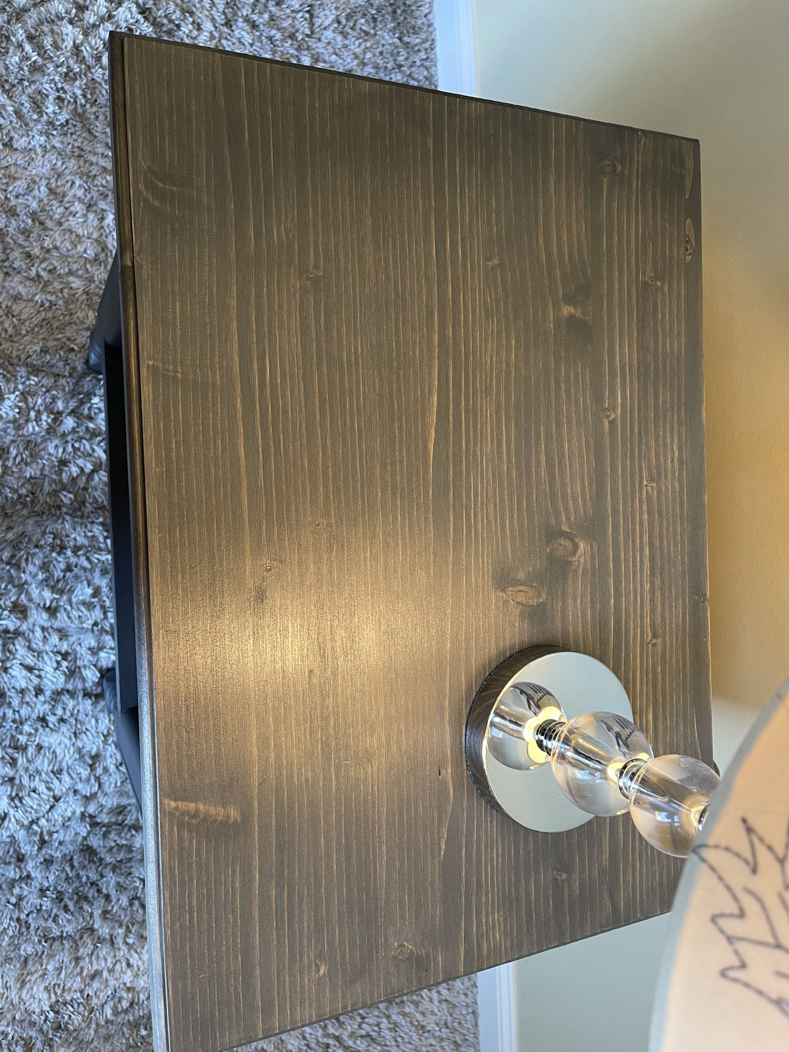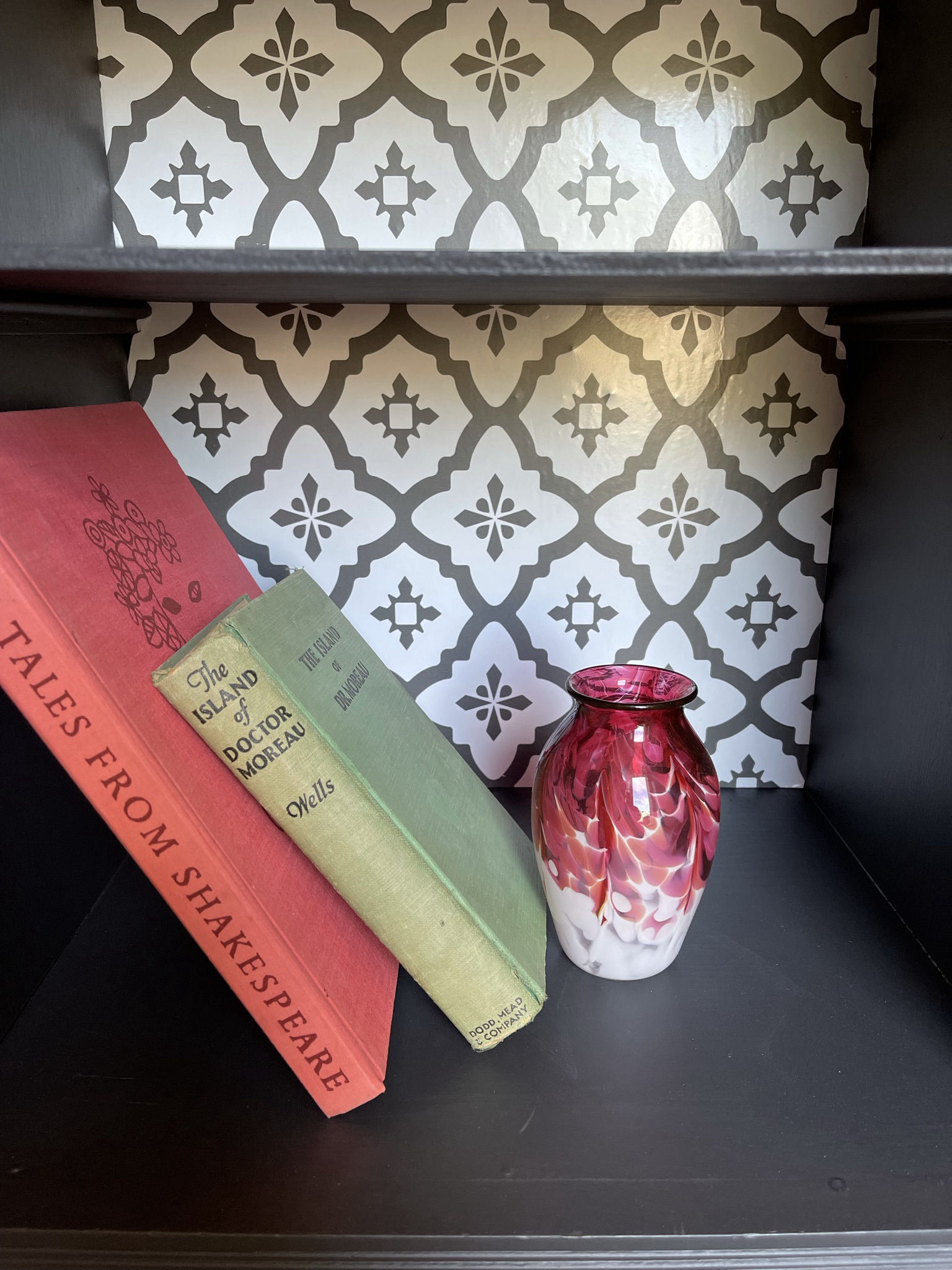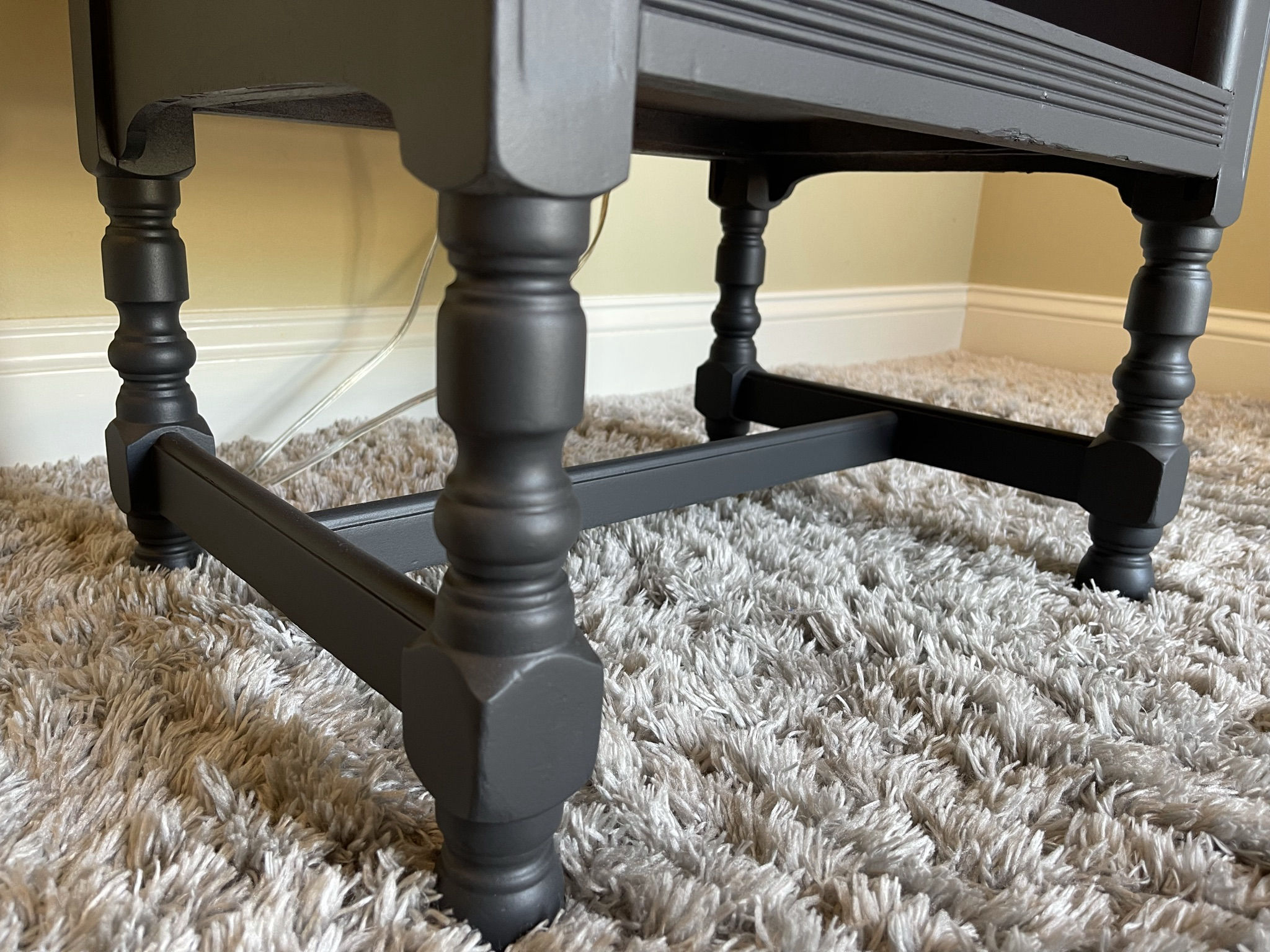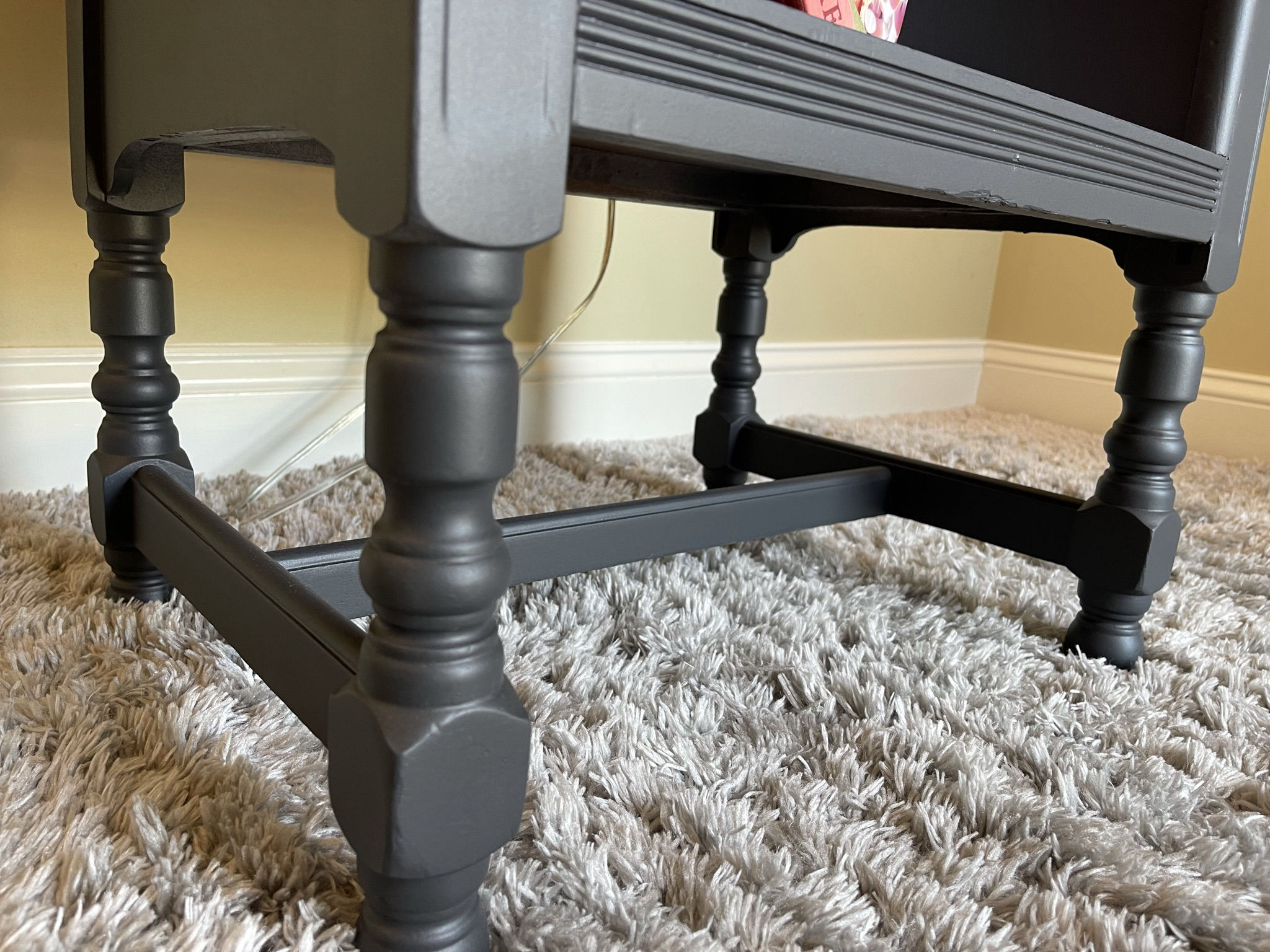 This antique side table started life in the 1940s and was later used as a telephone stand. Being in rough shape, we built a new top and refinished everything in Fusion Mineral paint called Ash. The top has been stained to match. To add character and charm, part of the interior has been covered in contemporary vinyl wallpaper.